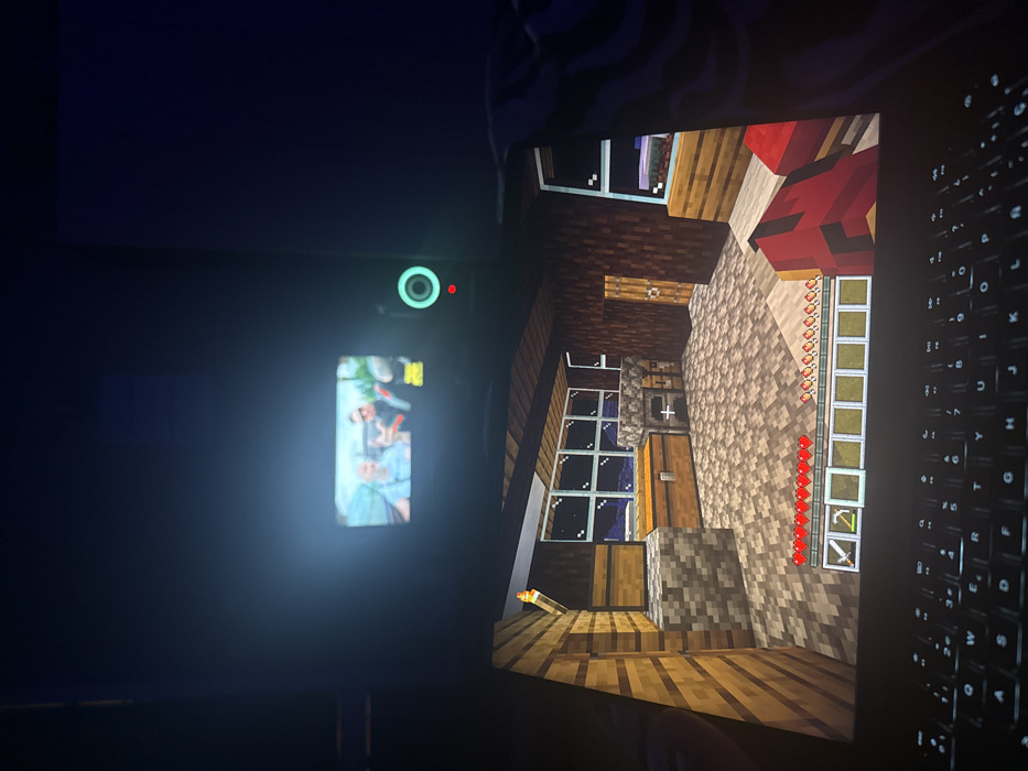 The scene depicts a dimly lit indoor environment in Sofia, Bulgaria, featuring two illuminated electronic screens. A smaller, rectangular electronic device, possibly a portable media player, is visible in the upper portion, displaying a video featuring two adult males. The man on the left has light hair and wears a light blue shirt, while the man on the right wears sunglasses and a dark top. The device exhibits a green circular light and a small red indicator light on its right side. Below this, a laptop computer is visible, displaying the video game "Minecraft" in a first-person perspective. The game screen shows an interior block-built room with wooden walls, a textured floor, a torch, two chests, a crafting table, a wooden door, and a large window looking out into a dark, possibly nighttime, environment. The game's user interface indicates full health (ten red hearts) and hunger (ten drumsticks), with a pickaxe selected in the inventory hotbar. A red, blocky object, likely an in-game character arm, is partially visible on the right of the laptop screen. The laptop's illuminated keyboard features a Cyrillic layout. A dark, textured fabric object is partially visible on the far right of the frame, likely a blanket or clothing item.