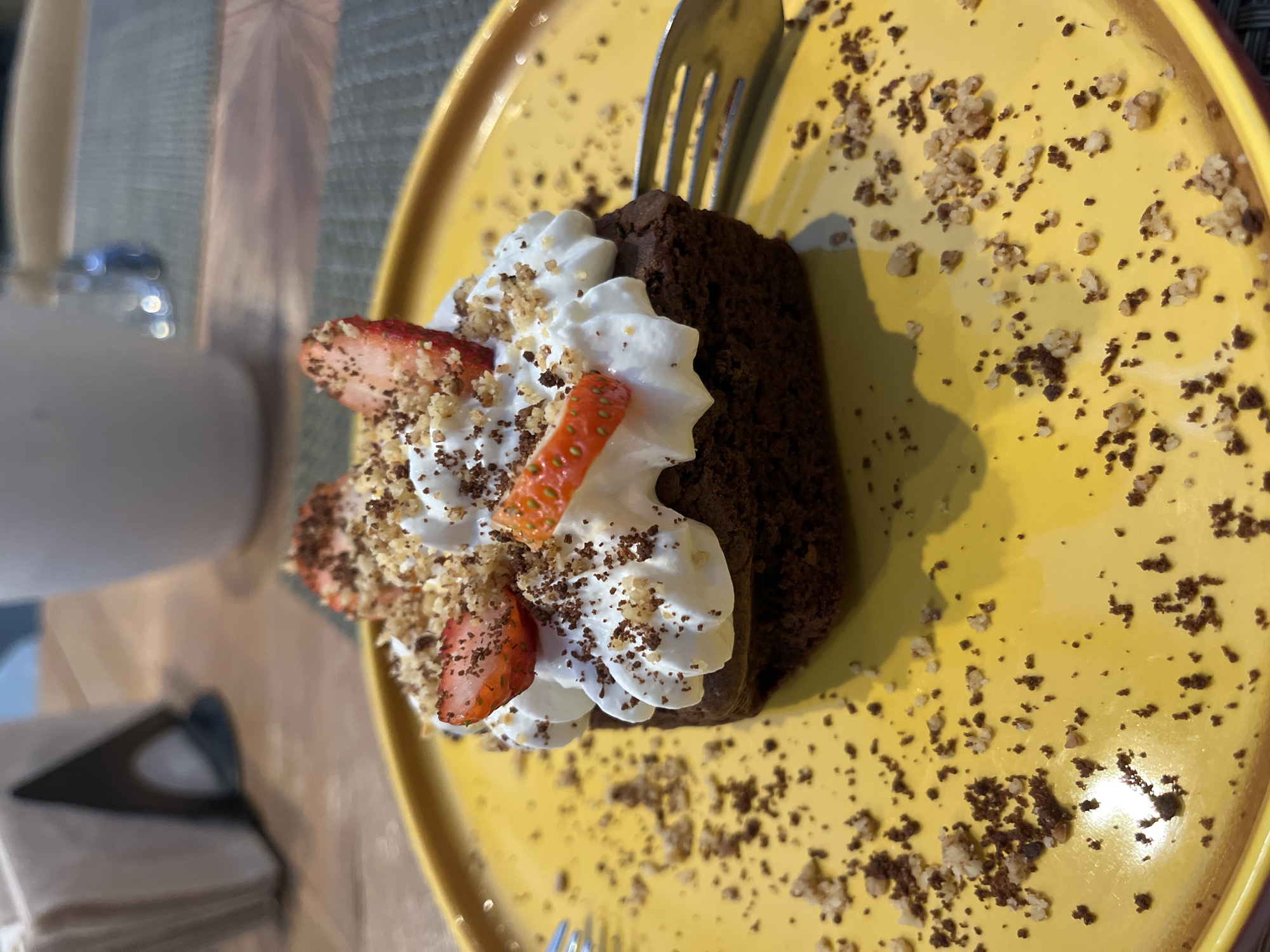 A dessert, possibly a brownie or slice of chocolate cake, is presented on a yellow plate. The cake is topped with whipped cream and sliced strawberries. A fork is inserted into the cake. Crumbled nuts or other toppings are scattered around the cake on the plate. The image was likely taken indoors at a dining table. The exact location within Unknown, Unknown cannot be determined from the image.