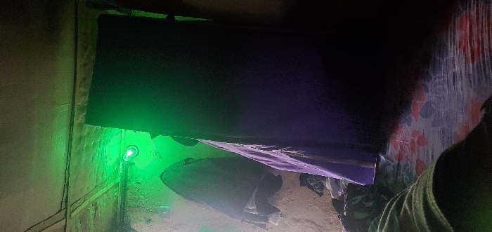 interior of a dimly lit room. A dark, rectangular object hangs from the ceiling. A green light illuminates the left wall, casting a vibrant hue. A light purple cloth hangs below the rectangular object, partially obscuring the floor. Part of a floral curtain is visible in the upper right corner. A person's torso is seen in the lower right corner, wearing a green shirt. The overall scene is somewhat cluttered and unconventional.