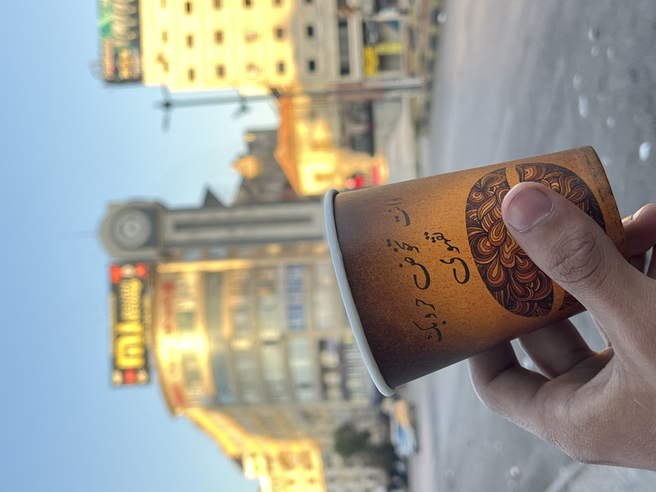 A right hand holds a brown disposable coffee cup in the foreground, angled slightly upwards