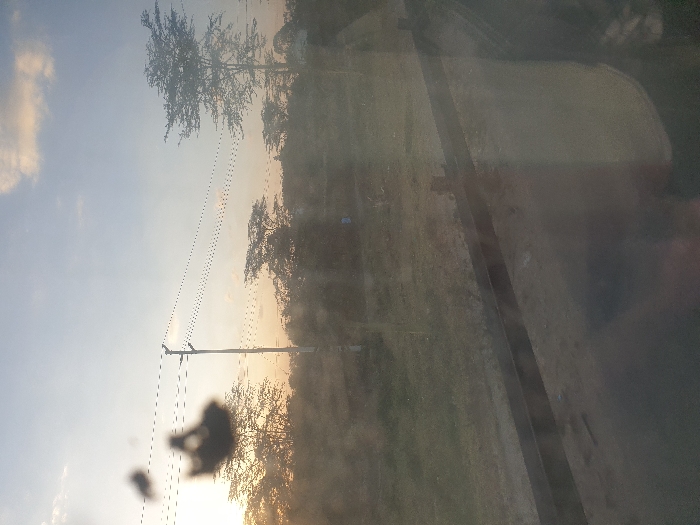 A hazy, landscape view shot through glass. A telegraph pole with lines stretches across the scene. Sparse trees line the horizon. A road or track appears on the right. The sky is pale, suggesting dawn or dusk. Overall, the image is somewhat blurry and obscured by the glass.