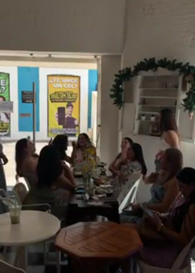 A group of about ten women are sitting at a large dark wooden table and smaller white tables inside a brightly lit café. The women are casually dressed in various outfits. Some of them are looking at their phones while others are talking and laughing. The table is covered with plates of food and drinks. There are some yellow flowers in a vase. The café has a black and white checkered floor and white walls, with a decorated shelf and hanging garland. An open doorway leads to an outside area. A large advertisement can be seen outside of the café.