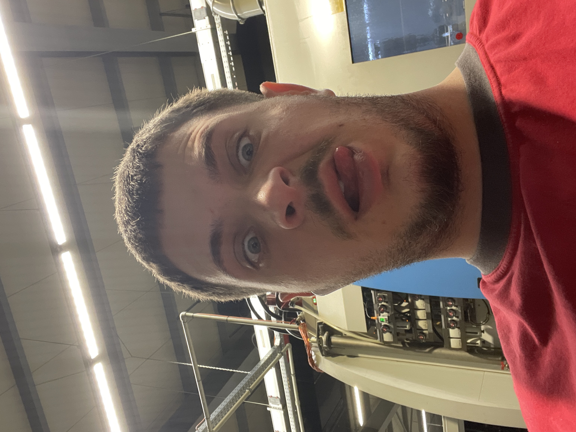 A man with short brown hair, light eyes, and a beard is sticking his tongue out at the camera. He is wearing a red t-shirt with a grey collar. The background appears to be an industrial setting with overhead fluorescent lighting, metal beams and equipment. The location is indeterminate due to a lack of specific identifiers. The suggestion of Lyaskovets, Bulgaria, cannot be confirmed or denied based on the visual data provided.