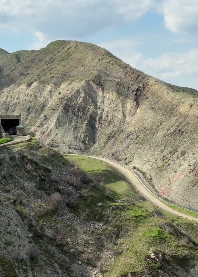 panoramic view of a mountainous landscape with a power station. At the beginning of the video, the camera is focused on a tunnel entrance on the side of a mountain. As the video progresses, the camera pans right, revealing a winding road, and then the power station, which is light blue and green and is located between a hillside and a river. Power lines extend from the power station. The background consists of rolling hills and a few scattered buildings. The sky is blue with scattered white clouds.