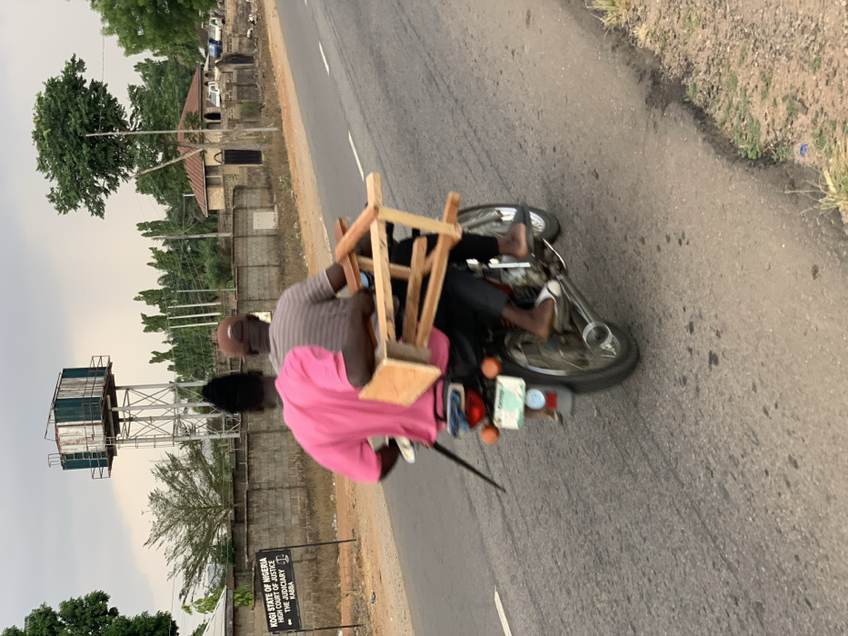 A man rides a motorcycle on a paved road, carrying a stacked wooden chair. The rider wears black pants, a tan and brown striped shirt, and a brown hat, with bare feet on the footrests. Another person in a pink top sits behind him. A sign for "Kogi State of Nigeria High Court of Justice" is visible along with a water tower. The scene suggests a developing region, with a mix of infrastructure and personal transportation.