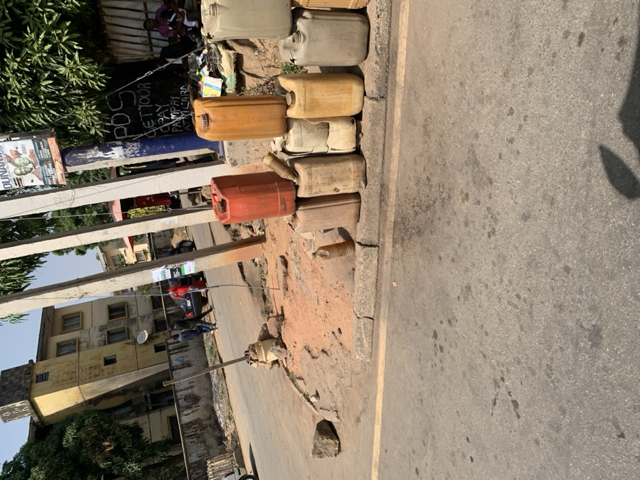 The image displays an urban street scene in Jos, Nigeria, under bright daylight. In the foreground, a grey asphalt road with a faded yellow lane marking on its left edge transitions to an unpaved, reddish-brown dirt shoulder. This shoulder is elevated and bordered by concrete curb stones. A collection of approximately eleven plastic jerrycans of varying colors (orange, brown, beige, and grey) are arranged on and directly behind the curb, with one smaller clear plastic bottle also present on the dirt. Three tall, grey concrete utility poles stand vertically along the roadside. In the mid-ground on the left, a two-story building, appearing worn with faded yellow paint, features multiple windows and a satellite dish. This building is set back behind a low concrete wall and green foliage. On the road, two male figures walk away from the viewer; one wears a dark shirt, the other a lighter garment. A dark sedan is visible on the road, with a portion of a white vehicle on the far left. On the right mid-ground and background, a person, likely female, is seated under a dark awning or shelter, partially obscured by utility poles and objects. This setup suggests a vendor's stall. A black sign with white lettering reads "P.O.S. GET YOUR OPAY PAMPAY ATM CARA," indicating a point-of-sale service. An advertising banner featuring two individuals is attached to one of the utility poles. The background on the right consists of dense green foliage behind a wall. Shadows from unseen objects extend onto the asphalt road in the foreground.