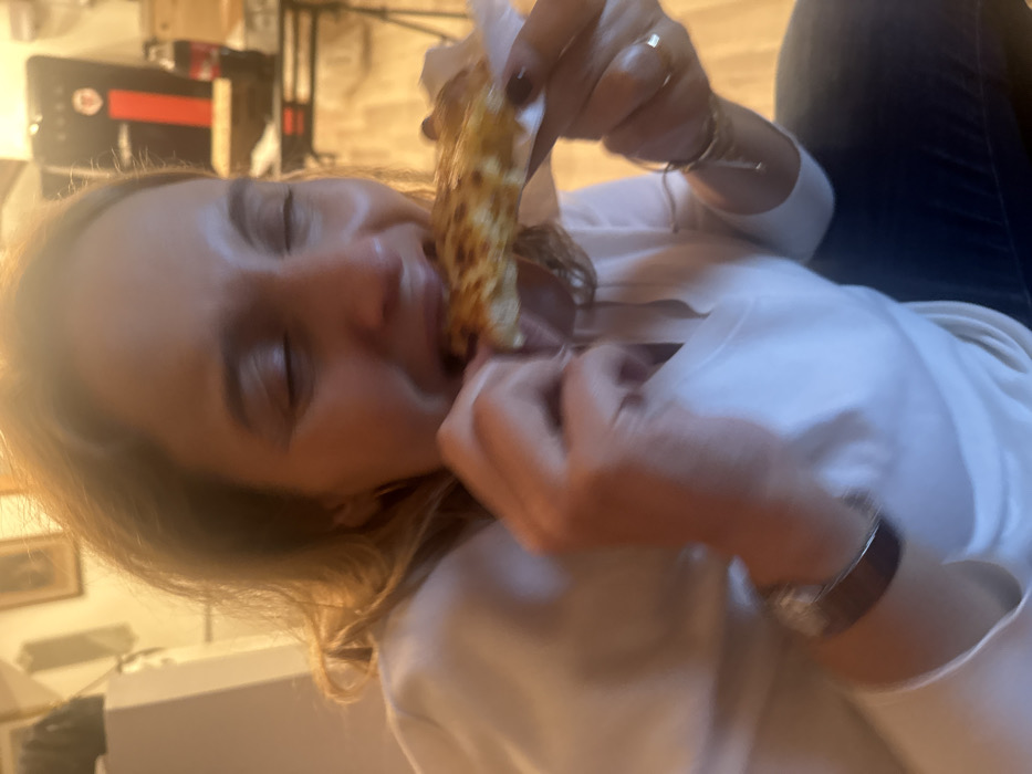 The image captures a female individual indoors in Villeurbanne, France, from a mid-shot perspective. The subject, possessing light-colored hair, is shown with her eyes closed and mouth open, actively biting into a slice of pizza. Her facial muscles around the eyes and mouth are contracted, suggesting an intense sensory experience. She wears a light-colored, collared shirt and dark trousers. A silver-toned watch is visible on her left wrist, while her right wrist displays multiple thin bracelets and a gold-toned ring on her ring finger. Her fingernails are painted with a dark polish. The pizza slice, appearing to have melted cheese and a browned crust, is held with both hands and rests on a white paper wrapper or napkin. The background is blurred but reveals a framed object on a wall to the upper left. To the upper right, a black appliance with a vertical red stripe and a circular emblem is partially visible, adjacent to a Coca-Cola bottle standing on a surface. Below these, a portion of a table or counter and a tripod-like structure are discernible. The scene is illuminated by warm, bright lighting.