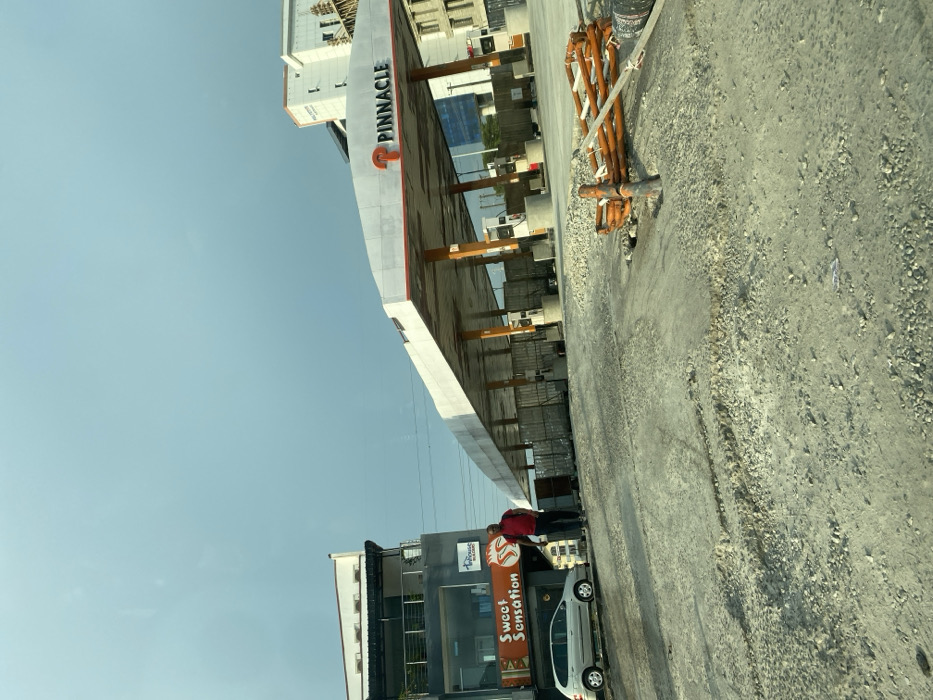 The image depicts an outdoor urban scene in the city of Ilado, Nigeria, characterized by commercial structures and rough ground. In the foreground, the ground consists of unpaved, uneven dirt and gravel with visible tire tracks and debris, including a pile of orange barriers or scaffolding elements on the right. To the left, a multi-story building features a ground-floor commercial unit with a large glass facade and a prominent "Sweet Sensation" sign in orange lettering. Above it, a smaller sign or logo is partially visible. A silver hatchback car is parked in front of this building. Two adult males are observed near the "Sweet Sensation" entrance; one in a red shirt and dark trousers walks towards the right, while the second, partially obscured, stands closer to the building. To the right of the scene, a "Pinnacle" branded gas station is visible under a large, white, sloped canopy supported by multiple orange pillars. Beneath the canopy, several white fuel pumps are present. A light-colored corrugated metal fence separates the gas station from the unpaved foreground. In the far background, another multi-story building, potentially under construction, is visible. The sky is a light blue-grey, indicating overcast conditions.