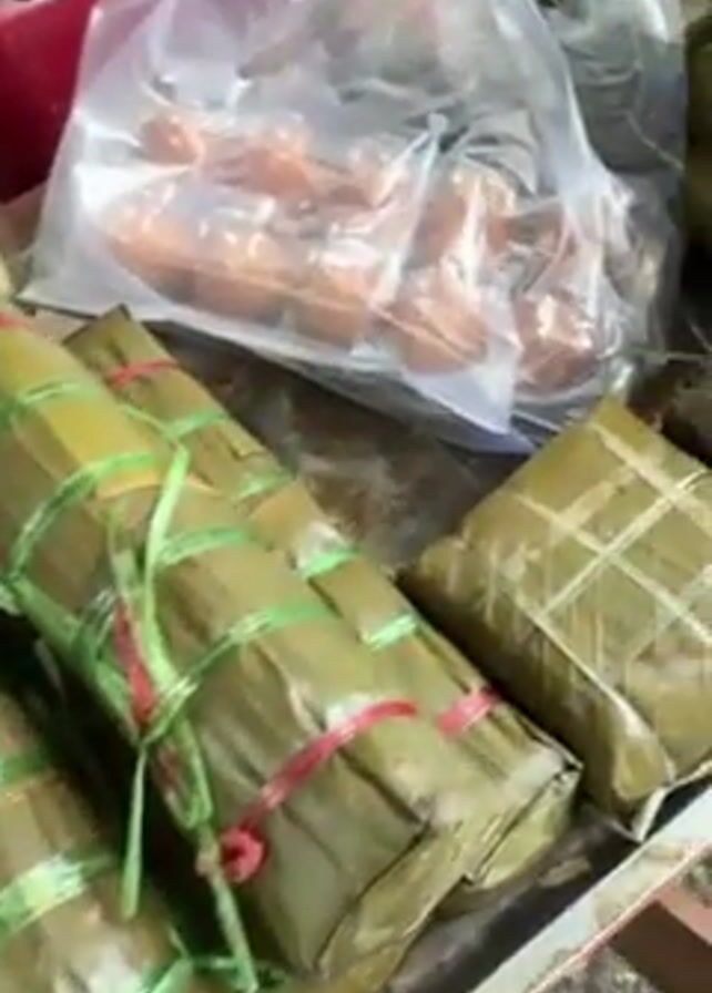 close-up of a metal tray filled with various packages wrapped in banana leaves. Some of the packages are long and cylindrical, tied with green and red plastic strings. Others are square-shaped, bound with thin, light-colored natural twine. A clear plastic bag containing what appear to be small, brown sausages rests next to the wrapped packages. In the background, blurred items like bottles and jars are visible on a shelf. A QR code is placed next to the cylindrical packages.