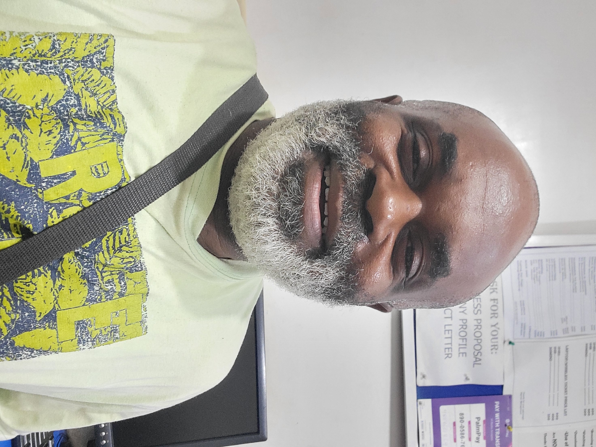 A close-up, rotated image depicts a dark-skinned man with a shaved head and a white beard. He is wearing a light yellow t-shirt with a dark grey strap across his chest. He is smiling slightly. Behind him, a wall is visible with printed documents and a blue sign with white lettering including the words "BUSINESS PROPOSAL" and "PROFILE." A black monitor edge appears on the left. The location is not specified, but judging from the signage, it may be an office or administrative space. There is no indication of Dadi Riba, Nigeria in the image.