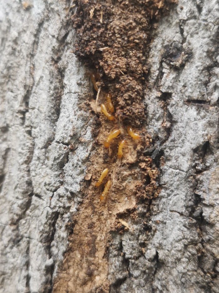 - "Approximately ten to fifteen pallid, yellow-orange termites are observed traversing and congregating within a partially disrupted, dark brown earthen gallery constructed upon the rough, gray-toned bark of a tree" by FM-t8Vzk1, licensed under CC BY 4.0