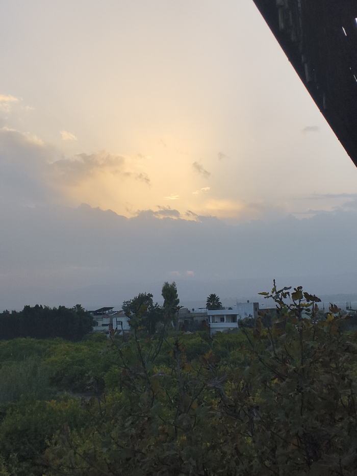 A scenic view showcases a serene sunset, with sunlight peeking through a layer of clouds in the sky. Lush green vegetation fills the foreground, with trees and shrubs obscuring some white buildings. A partial structure, likely a rooftop or frame, appears in the upper right corner, adding a sense of enclosure to the scene. The landscape evokes a tranquil atmosphere under a sky transitioning from daylight to dusk.