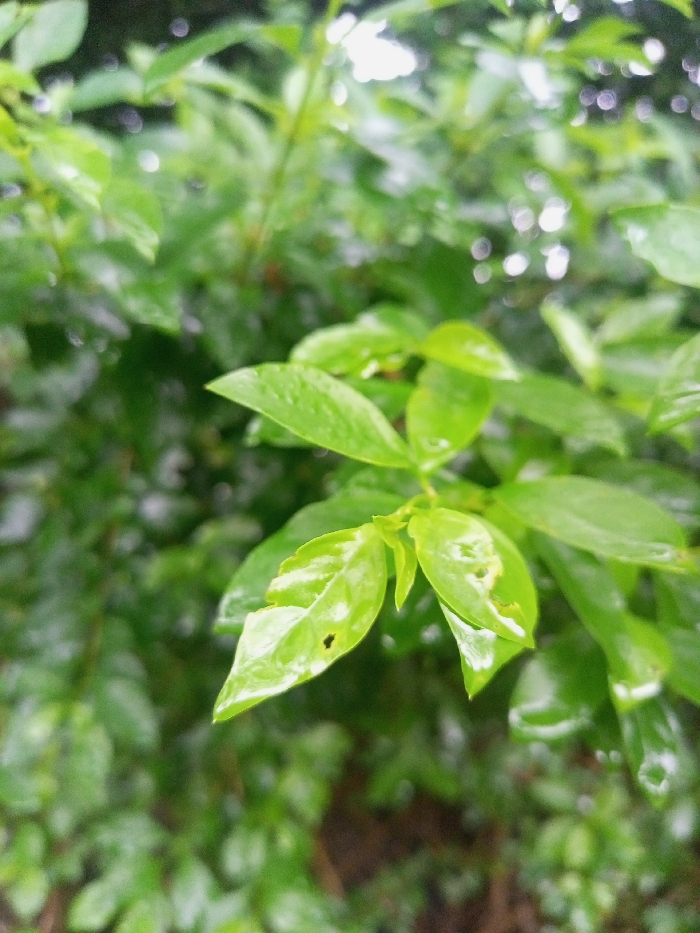 A close-up photograph captures a cluster of vibrant green leaves from a plant or bush, situated in Beni, Nepal. The leaves are saturated with numerous small water droplets, indicative of recent precipitation or high humidity. Several leaves exhibit minor damage, including small circular perforations and irregular edges. The foreground foliage is in sharp focus, displaying a vivid light green hue. The background consists of heavily blurred, out-of-focus green vegetation, with indistinct circular bokeh highlights suggesting ambient light reflections through the distant foliage. No individuals, animals, or man-made structures are visible. The scene depicts a natural, outdoor environment following rainfall.