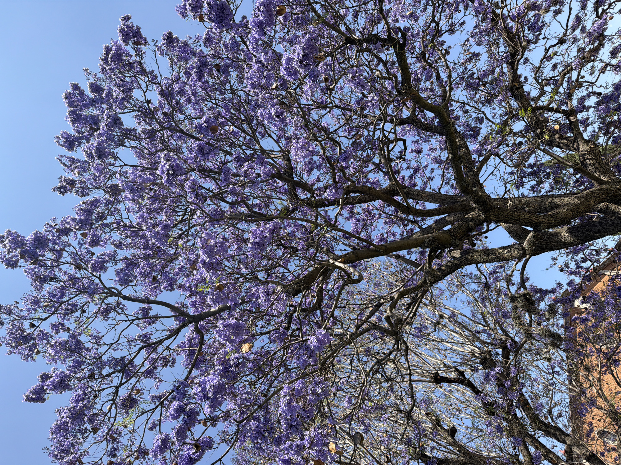 This image depicts a mature Jacaranda tree (Jacaranda mimosifolia) in full bloom, located in San Andrés Cholula, Mexico. The tree occupies the majority of the frame, showcasing a dense canopy of vibrant purple flowers clustered along its dark, textured branches and twigs. Numerous brown, dried seed pods are also visible hanging from the branches. A clear, bright blue sky is visible as the background, interspersed through gaps in the foliage. In the lower left quadrant, partially obscured by the tree's branches, a section of an urban structure is discernible, featuring an orange or terra cotta colored wall and a dark roof line. No individuals or specific activities are present within the scene. The lighting suggests daylight conditions.