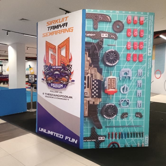 A large blue and white banner with the text "Sirkuit Tamiya Semarang" and "The Grand Podium" in red and black