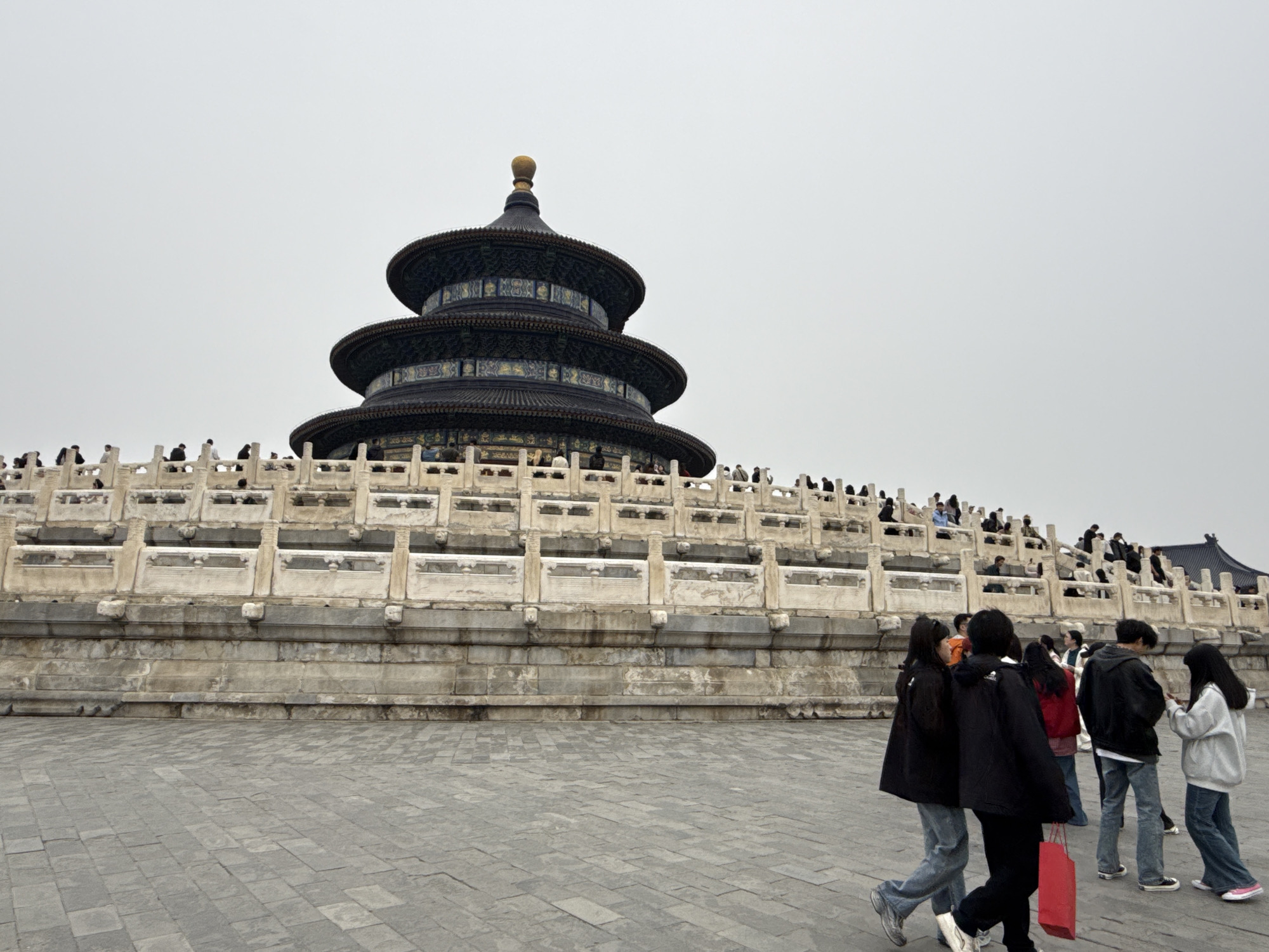 The image displays the Hall of Prayer for Good Harvests, situated within the Temple of Heaven complex in Dongcheng District, Beijing, China. The scene is observed under an overcast, light gray sky. The central subject is a large, three-tiered circular building with dark blue roofs and a prominent golden orb finial at its apex. This structure is elevated on a multi-tiered white marble platform, which features ornate balustrades on each level. Numerous indistinct figures, presumably visitors, are visible on and around these balustrades. In the foreground, a group of approximately eight individuals traverses a gray paved courtyard from left to right. These individuals appear to be young adults and are dressed in casual attire. A male in a black jacket and blue jeans is centrally positioned, carrying a red shopping bag in his right hand. To his immediate left is a female also wearing a black jacket and blue jeans. To his right, a female in a red jacket and blue jeans is partially obscured. Further right, a male in a black jacket and blue jeans walks near a female dressed in a light gray hoodie and blue jeans with pink-soled shoes. All foreground subjects are in motion, with no specific interactions beyond their close proximity and shared direction of movement.