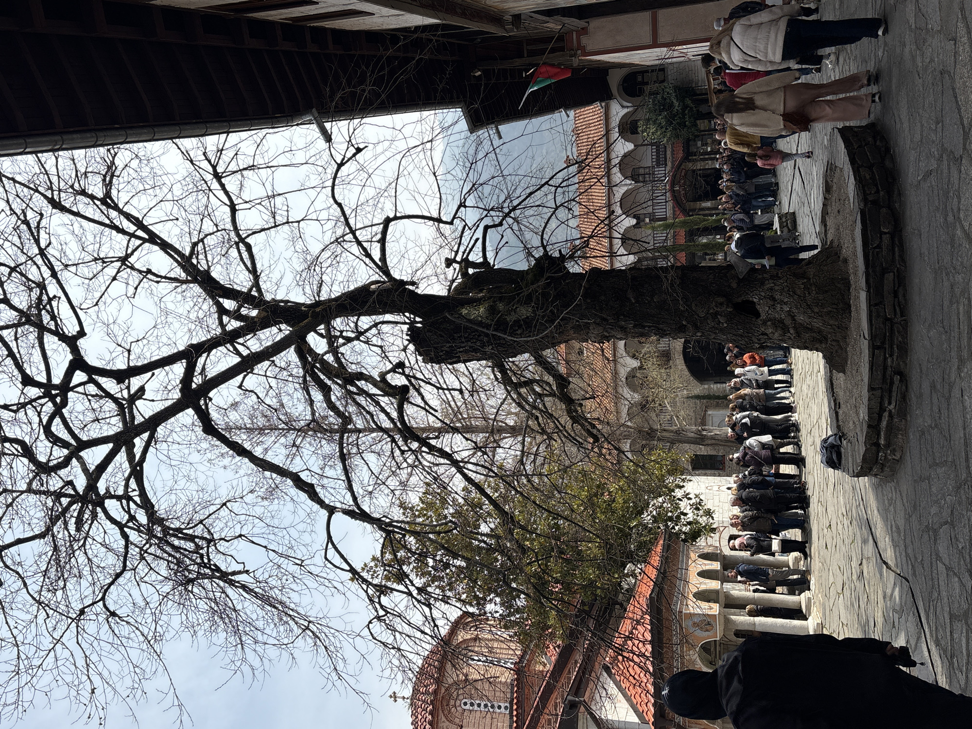A daytime shot shows a group of people in a courtyard in Bachkovo, Bulgaria. An old, thick tree with many bare branches stands in the center of the courtyard. A few branches have green leaves. People stand behind and in front of the tree, facing inwards. Behind the people, there are buildings with red tile roofs and white columns. A Bulgarian flag is visible. Some of the people are wearing winter coats. The ground is paved with stone.