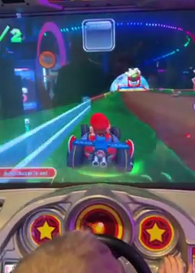 A child plays a Mario Kart arcade game