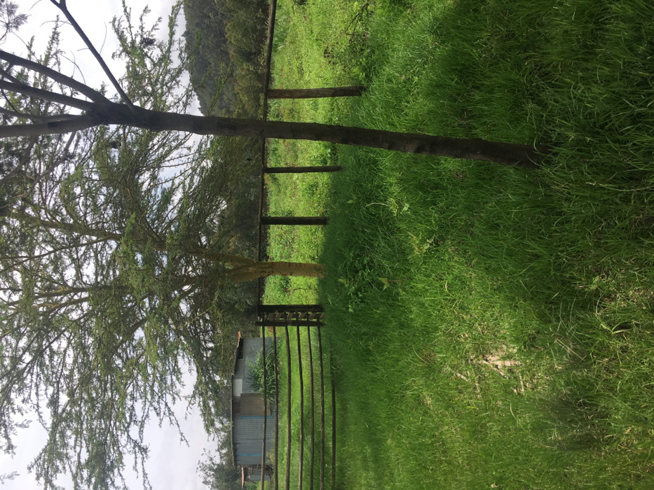 The image displays an outdoor, rural landscape in Limuru, Kenya, under a predominantly overcast sky. The foreground is covered in dense, unkempt green grass, approximately 20-40 centimeters in height, with some weeds. A small, lighter-colored dirt patch is partially visible through the grass in the lower-left center. A slender, dark-barked tree trunk stands vertically on the far right, partially obscured by the foreground vegetation, casting a faint shadow to its right. In the midground, a wooden fence line extends horizontally across the frame. This fence is constructed from unrefined horizontal wooden logs or branches attached to vertical wooden posts. A section of the fence on the left functions as a gate, composed of vertical wooden slats, which appears partially open or designed with significant gaps. Behind this fence, another expanse of tall green grass is visible. A prominent tree, characterized by a light yellow-green trunk and a dense, sprawling canopy of small green leaves, is situated in the left-center behind the fence. To the left of this tree and further behind the fence, a small structure constructed of weathered corrugated metal, exhibiting faded blue, grey, and rust tones, is present, suggesting a shed or outbuilding. Sparse green vegetation grows around the base of this metal structure. Additional dark wooden fence posts are visible extending towards the right in the midground. The background consists of a dense treeline forming a dark green horizon, followed by a range of forested hills or mountains under a diffused, light grey sky with scattered white clouds. No individuals, animals, or specific actions are discernible within the scene.