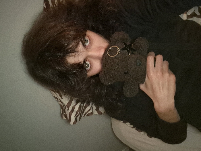 A person with long, dark, curly hair and light-colored eyes is lying down, holding a small, dark brown teddy bear close to their chest. The teddy bear has a black star and a golden ring attached to it. The person is wearing a dark-colored long-sleeved shirt. They are lying on a bed with a zebra-striped pillow or blanket near their head, and a white sheet or blanket underneath them. The background appears to be a plain wall or surface. The image is rotated slightly to the left.