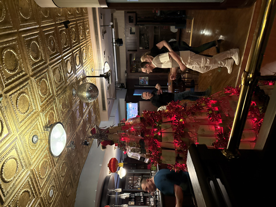 An interior view of a bar or club in Guilin, China, features a festive, illuminated environment. The ceiling is covered with embossed golden metal tiles, from which a large, round light fixture and a disco ball are suspended. In the center foreground, a large, conical structure, resembling a Christmas tree, is constructed from stacked clear glass bottles, many appearing to be liquor bottles with labels. This structure is heavily decorated with red tinsel and red string lights, which are illuminated, and topped with a large, glittery silver star. To the left, a male bartender with short hair, wearing a dark teal t-shirt, stands behind a dark wooden bar counter lined with bottles and glassware. Further right, in the mid-ground, three individuals are engaged in activity on a wooden floor. A male with short dark hair, wearing a black long-sleeved shirt and dark pants, stands gesturing with his hands. To his right, another male with glasses, wearing a light-colored, vertically striped short-sleeved shirt, light cargo pants, and white sneakers, is captured in motion, his right leg slightly raised. Behind him, a female with blonde hair, wearing a black top and dark pants, moves in tandem. In the background, dark wooden paneling and cabinetry are visible, along with a flat-screen television displaying a colorful graphic. Additional lighting includes red Chinese lantern-style fixtures near the bar. A brass railing is partially visible in the bottom right foreground.