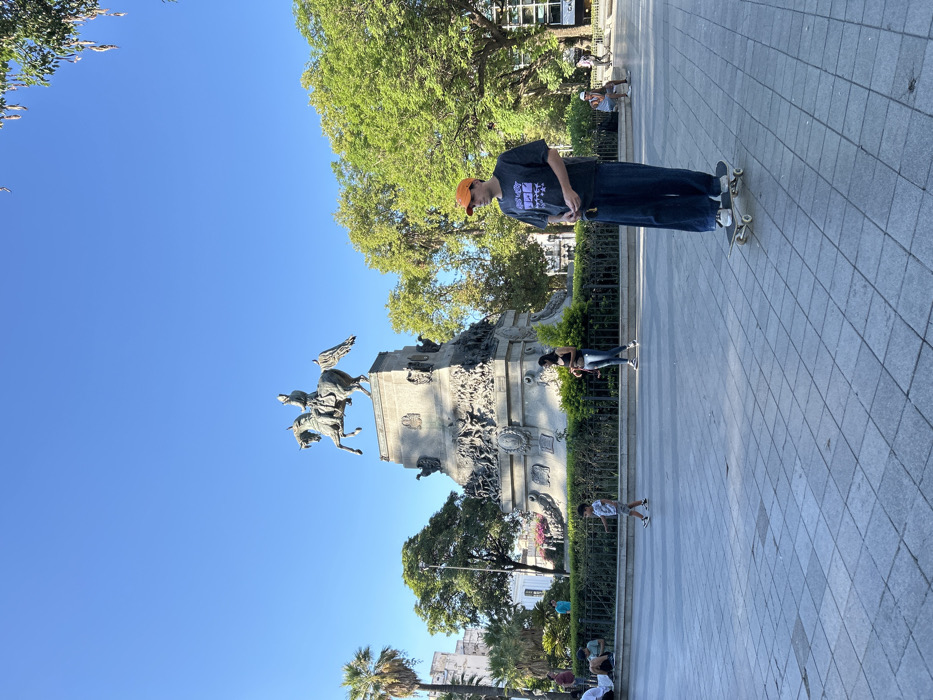 A man wearing an orange hat and dark clothing stands on a skateboard in a park setting. A large monument depicting a man on horseback rises in the background. Other people are walking around in the park. The sky is clear blue. Trees are scattered throughout the area. The ground is paved with square tiles.