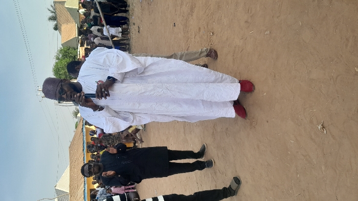 The scene depicts an outdoor gathering in Akwanga, Nigeria, on unpaved light brown earth