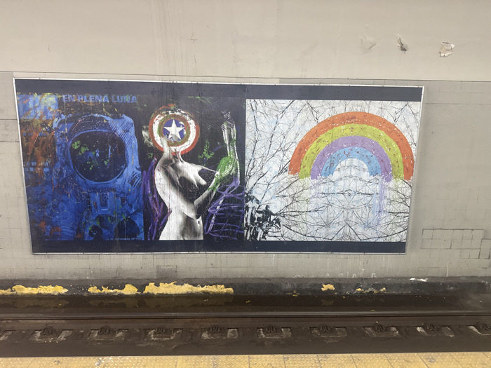 A large, rectangular artwork, framed in white, is mounted horizontally on a light gray wall within a Subte station in Buenos Aires, Argentina. The artwork is composed of two distinct panels. The left panel presents a mixed-media collage. On its left side, a blue-toned image features an astronaut's helmet and torso against a dark, textured background, with text including "EMBLEMA LUNA" partially visible. To the right, a grayscale depiction of a bare-chested female torso is shown, with a red, white, and blue Captain America shield superimposed over the head area. Green and purple abstract elements are visible in the background around this figure. The right panel features a stylized rainbow, consisting of distinct bands of orange, yellow, green, purple, and light blue, rendered against a background densely filled with white, bare tree branches. Paint drips are visible beneath the rainbow. Below the artwork, a dark-colored horizontal ledge or railing spans the scene, displaying patches of chipped yellow paint along its upper edge. Beneath this ledge, a single dark-colored subway track is visible. The foreground reveals a section of a textured yellow platform edge. The wall above the artwork is plain light gray, exhibiting minor surface imperfections.