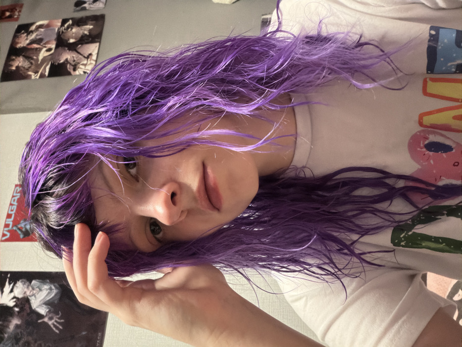 A person with long, wet, vibrant purple hair poses close to the camera. Their hand is near their face, framing the shot. They wear a white t-shirt, the design partially visible. The background features wall decorations, including what appears to be posters with dark and intense imagery. The overall image is a close-up, focusing on the individual's face and striking hair color.