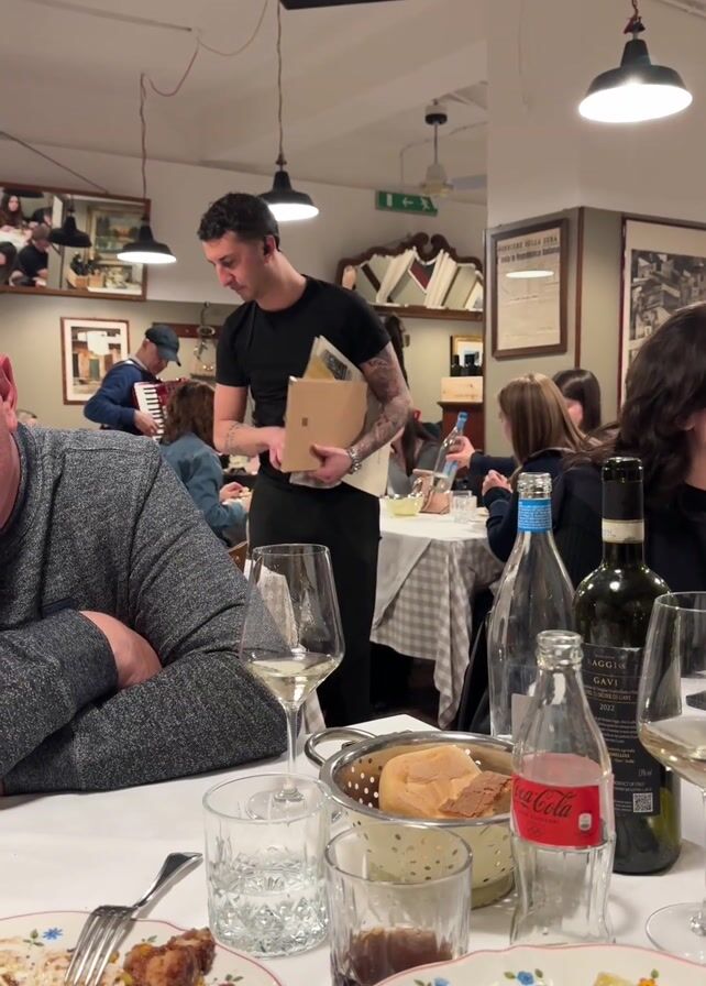 The video depicts a bustling scene inside a restaurant. Tables are draped with white tablecloths, laden with wine bottles, water bottles, glasses, plates with remnants of food, and bread baskets. The plates are decorated with floral patterns. Diners are seated at the tables. A waiter, clad in black, moves through the room carrying a file. An accordion player, wearing a cap, performs for the patrons. Pictures and frames adorn the walls. The ceiling features hanging lights and what appears to be an old speaker. Overall, the atmosphere suggests a busy and lively dining experience.
