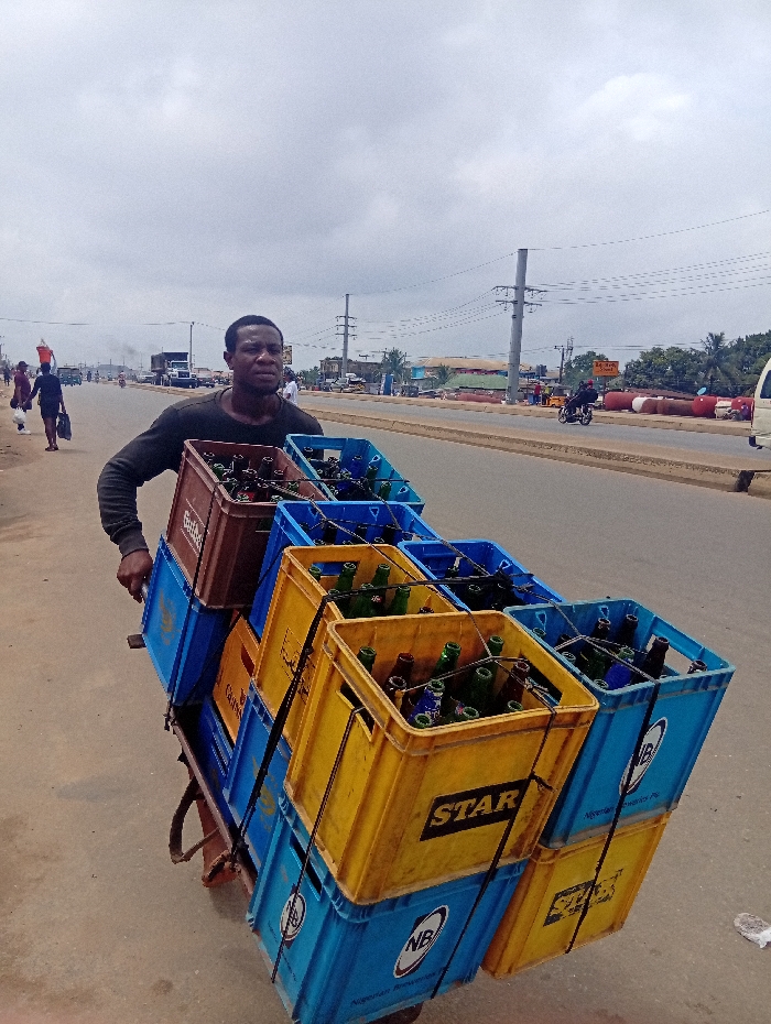 A forensic examination of the image reveals an outdoor scene on a paved road in Ura Nta Umuarandu, Nigeria, under an overcast sky. A dark-skinned male, appearing to be in his 30s to 40s, wears a dark long-sleeved shirt and is positioned slightly left of center, facing the viewer. He is actively pushing a two-wheeled handcart laden with at least eight stacked plastic crates secured by black straps. The crates contain numerous green and brown glass bottles. Crate colors include brown (one), blue (several, some marked with "NB" and "Nigerian Breweries"), and yellow (several, some marked with "STAR"). The man's right hand is visible on the cart's handle. To the left, a dirt shoulder parallels the road, with several pedestrians walking in the distance and a large truck visible further down the road. To the right, a multi-lane paved road with a central median features moving traffic, including a white van and a motorcycle. Utility poles with multiple power lines are present, alongside large red and white cylindrical objects beyond the median. Green foliage and structures are visible in the background.