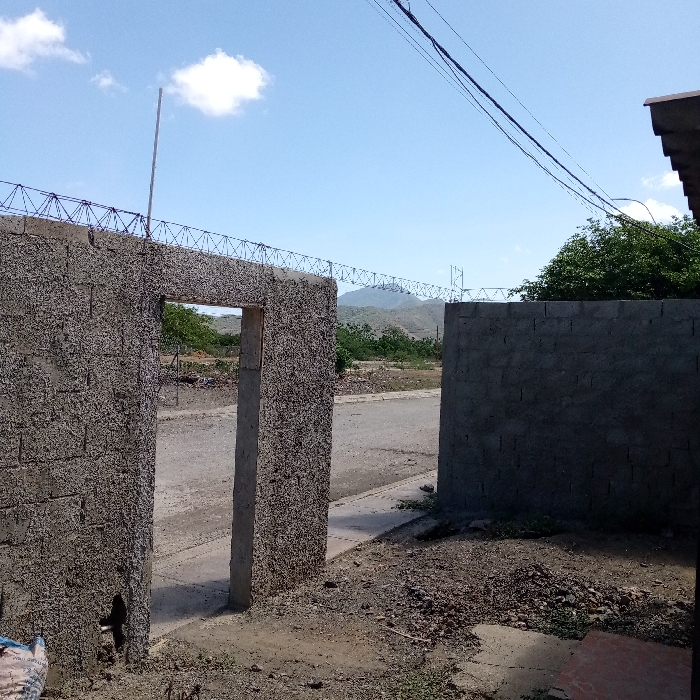 The image displays an outdoor construction scene in Juan Griego, Venezuela, characterized by a clear blue sky with one visible white cloud. In the foreground, two unfinished concrete block walls frame the view. The left wall, featuring a rough, textured surface, contains an empty rectangular doorway opening supported by a concrete post. Metal rebar lattice work (truss joists) extends horizontally along the top of this wall, suggesting ongoing structural development. A thin, light-colored pole protrudes vertically from the top of the left wall. The wall on the right appears smoother and partially constructed. The immediate ground is composed of dry, uneven soil with scattered small rocks and sparse green vegetation. A partially visible white bag, possibly containing building materials, is situated in the bottom-left corner. Beyond the walls, a gray, asphalt-paved road runs across the midground. The area past the road consists of arid terrain with scattered green scrub and distant, dry hills or mountains. Overhead, multiple black utility wires traverse the upper right portion of the frame. Additional rebar lattice structures are visible extending towards the distant hills. No individuals or specific activities are depicted.