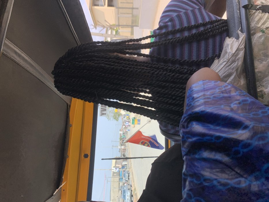 The image displays an urban street scene viewed from inside a yellow-framed vehicle, likely a tricycle. In the immediate foreground, the back of a person with long, dark, braided hair, wearing a horizontal striped shirt in shades of blue/purple and white/light grey, is prominent on the right. Adjacent to this individual, a white plastic bag rests on the seat. To the left, a portion of another person's arm, dressed in dark blue fabric with a lighter blue chain-link pattern, is visible. Through the vehicle's opening, a paved road stretches into the distance under a clear, bright sky. On the left side of the road, several light-colored cars are visible, either parked or in motion. On the right side of the road, a small flag, predominantly red and dark blue (or black) with a white circular emblem and partially visible text including "APOLLO" and "AVILA," is affixed to a pole. This flag serves as a key indicator, placing the scene in Ikorodu, Nigeria, specifically near an Apollo or Avila development. Various commercial and residential structures line both sides of the street in the middle ground and background. Distant pedestrians are observable on the road and sidewalks. A faint white sign bearing the letters "YVD" is discernible above a green tree in the mid-right portion of the background.