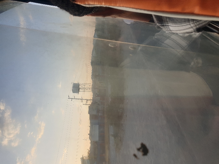 cityscape through a clear barrier, possibly a window. Power lines and a water tower stand against a cloudy sky during the golden hour. The reflection on the barrier obscures the view, with a glimpse of plaid fabric and an orange object at the top. A dark smudge is present on the barrier, further distorting the scene.