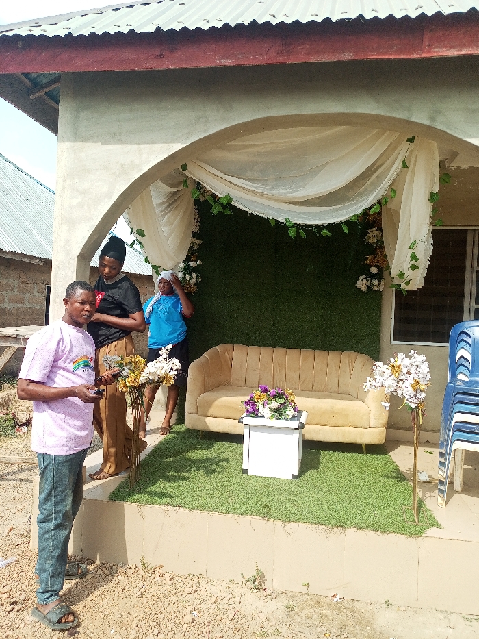 The image captures an outdoor event setup and three individuals in Erin-osun, Nigeria. **Location:** The scene is set outdoors in Erin-osun, Nigeria, in front of a light-colored, unadorned single-story building with a corrugated metal roof. The ground in the immediate foreground consists of bare earth and small gravel. In the background, another building with an unplastered concrete block wall and a corrugated metal roof is visible. **Structures and Decorations:** * An arched opening is integrated into the building's facade, framing a decorative backdrop. * The backdrop features a dark green artificial grass panel, approximately 2 meters wide and 1.5 meters high, adorned with artificial green ivy garlands and clusters of white and cream flowers. * White sheer fabric drapes are suspended from the top of the archway, cascading downwards and framing the green backdrop. * A beige, channel-tufted two-seater sofa with gold-colored legs is centered on a rectangular section of green artificial grass, approximately 2.5 meters wide by 1.5 meters deep, laid directly on the ground. * A small white rectangular table, about 0.5 meters high, is positioned in front of the sofa, holding a floral arrangement of purple, white, and yellow artificial flowers. * Two tall, slender gold-colored stands, each topped with a cluster of white and cream artificial flowers, flank the sofa setup. * On the far right, a stack of five blue plastic chairs is visible against the building's exterior. A window with horizontal security bars is partially visible behind the chairs. **Individuals:** * **Subject 1 (Left foreground):** An adult male, light-skinned, wears a light pink short-sleeved t-shirt with a multi-colored graphic, blue denim jeans, and dark gray open-toed sandals. He holds a dark-colored smartphone in his left hand and looks towards the camera. * **Subject 2 (Center, behind Subject 1):** An adult female, dark-skinned, wears a black short-sleeved t-shirt and wide-leg brown trousers. She is barefoot and stands near one of the tall floral stands, looking towards the right side of the frame. * **Subject 3 (Right, behind the sofa):** An adult female, light-skinned, wears a bright blue short-sleeved t-shirt and dark shorts or skirt. She has a white head covering and is barefoot, with her right arm raised, seemingly adjusting the floral decorations on the backdrop. She faces towards the left side of the frame. **Actions and Interactions:** The three individuals are standing near the decorated event space. Subject 1 is holding a mobile device. Subject 3 appears to be making an adjustment to the decorations on the backdrop. No direct verbal or physical interaction is depicted between the subjects. The overall scene suggests preparations for an event or a casual gathering.