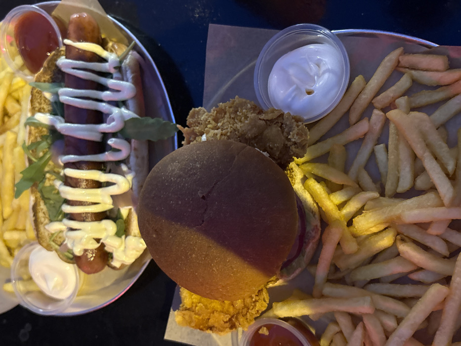 Two plates of fast food are positioned side by side. On the left, a hot dog is topped with a zig-zag of white sauce and garnished with greens, accompanied by french fries and a small container of sauce. On the right, a burger, seemingly with fried chicken, sits among a pile of french fries with a small container of white sauce and another of red sauce.