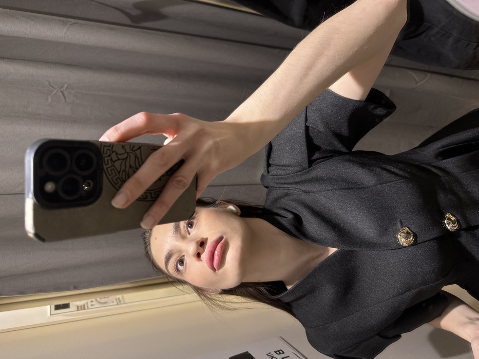 A young adult female is depicted in a close-up, chest-up selfie, taken in a mirror within a retail fitting room, specifically identified as being in Yekaterinburg, Russia. She has long, dark hair and fair skin, and wears a white wireless earbud in her left ear. Her expression is playful, characterized by wide-open eyes gazing upward and lips pursed into a distinct pout. She is dressed in a dark, likely black or charcoal, short-sleeved garment featuring a wide, structured collar and two prominent, irregularly shaped gold-toned buttons on the front closure. In her right hand, she holds a dark olive-green smartphone, equipped with a triple-lens camera array and an embossed gold Medusa head logo on its case, positioned to capture her reflection. The background consists of a plain light grey fabric curtain to the right and a light-colored, possibly mirrored, wall panel to the left, which reflects a vertical light source and indistinct reversed text. The scene is illuminated by overhead artificial lighting typical of a commercial changing area.