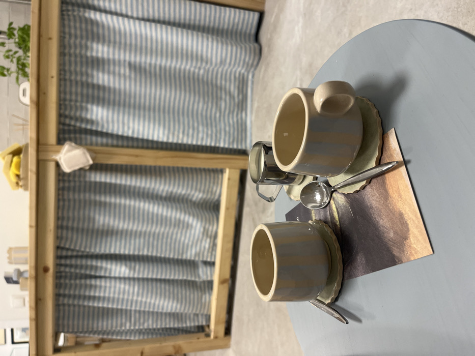 The image depicts an interior space within Kaiserslautern, Germany. In the foreground, a light gray circular table holds two ceramic cups, each light gray with vertical beige stripes, resting on ruffled light green coasters. Two silver-colored spoons are placed beside the cups. Between the cups, a small magazine or brochure with an abstract dark-toned cover featuring an orange-brown streak is visible. A small stainless steel pitcher containing a white liquid (likely milk) sits on another light green coaster behind the foreground objects. The background features a light-colored wooden frame structure, possibly a counter or partition, from which light blue and white striped fabric curtains are suspended. On top of the wooden structure, a wooden cutting board with yellow objects (possibly cheese or fruit) and a green potted plant are present. A small white fabric item or bag hangs from the wooden frame. The floor appears to be a light-colored, possibly concrete or tiled, surface. No individuals are present in the scene.