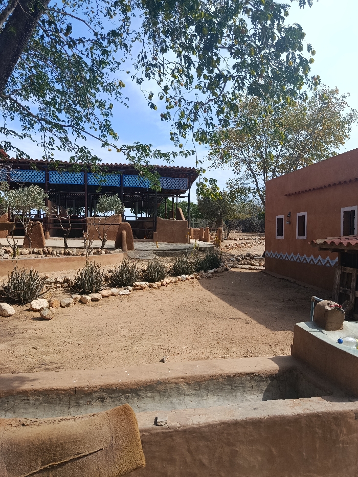 This static, outdoor daytime image depicts an arid or semi-arid scene in Guayacancito, Venezuela, under a clear blue sky with sparse clouds. In the immediate foreground, a low, rectangular structure made of earth or mud features an empty basin. A light brown, textured mat or fabric is draped over the nearest edge of this structure. Adjacent to it on the right, a raised, earth-toned platform holds a round, woven brown container and at least two clear plastic bottles, one with a blue cap. The midground consists of dry, light brown soil or sand, interspersed with small rocks. Raised earth borders delineate planted areas, featuring rows of bushy, succulent-like plants. To the right in the midground, a single-story, reddish-brown building, consistent with adobe construction, presents three rectangular windows with white frames. A traditional-style wall lantern is mounted between the two left windows. A distinctive white and light blue zigzag pattern is painted along the lower section of this wall, and a rustic wooden structure is affixed to its right side. In the background, a larger, open-air structure features a reddish-brown tiled roof supported by dark posts and blue-painted wooden lattice work on its upper walls. The interior suggests a communal or dining area. This structure appears to overlook a distant landscape or body of water. A large tree with green foliage partially frames the upper left portion of the image, while another tree with lighter green or yellowish leaves stands towards the right in the background. No individuals, explicit actions, or interactions are visible in the scene.