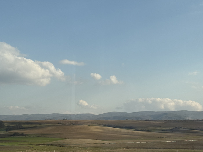 The image displays a rural landscape scene in the area of Baiachevo, Bulgaria. The upper portion of the frame features a light blue sky with scattered white cumulus clouds. A distant, hazy range of undulating hills or low mountains, appearing blue-grey and partially tree-covered, defines the horizon. The midground is characterized by rolling agricultural fields, exhibiting diverse shades of brown from recently tilled soil and green from vegetation. A subtle, light-colored track or path is visible traversing a field horizontally in the lower right section of the midground. A small cluster of structures is faintly discernible on a distant elevation within the central midground. The foreground consists of a narrow strip of mixed green and brown uncultivated ground. No individuals, animals, or direct human activity are present in the scene. The landscape is illuminated by natural daylight.