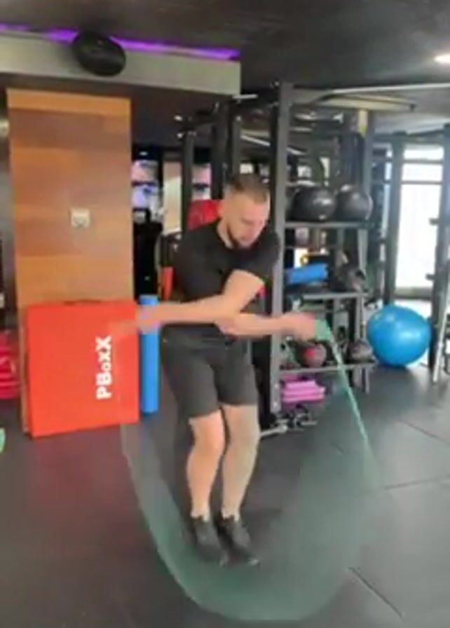 A man is jump-roping indoors in a gym. He is white, dressed in a black t-shirt and black shorts, and wears black shoes. The jump rope appears to be light green. He performs a variety of moves with the rope, including crisscrossing his arms. He has a short beard and short hair. The gym has a textured dark ceiling and tile flooring. There is a wooden panel on a wall next to a red rectangular box with the words “PBoXX” on it. Weight equipment is behind the man.