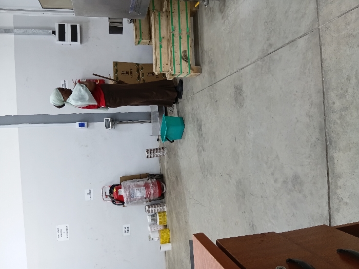 The scene depicts an interior view of what appears to be a functional workspace or warehouse in Shagamu, Nigeria. The environment features light gray/white walls, a concrete floor with visible seams, and overhead artificial lighting. A single individual, a woman, stands centrally in the frame, positioned slightly right of center. She wears a light-colored head wrap, a red short-sleeved shirt, and a long dark brown skirt or wrapper, with dark shoes. Her right arm is slightly raised, and she holds a dark, stick-like object downwards. She faces a white wall, where a large red wheeled fire extinguisher, partially covered in clear plastic, is located. To the left of the fire extinguisher, various items are stored on the floor: stacks of white and yellow cylindrical rolls (possibly labels), and several cardboard boxes. Handwritten signs are affixed to the wall above these items, bearing text such as "EVERY LIQUID" and "RIGHT PROPER." To the right of the woman, a teal-colored bucket rests on the floor. Behind her, a digital scale with a small white platform is visible. Further right, a stack of wooden crates and cardboard boxes are arranged. A large, metallic piece of industrial equipment or machinery is partially visible on the far right edge of the frame. Electrical boxes and conduits are present on the right wall. In the bottom left foreground, a section of a wooden cabinet or desk with dark handles is out of focus.