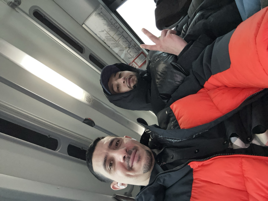 Two men on a public transport vehicle pose for a selfie. The man closest to the camera wears a jacket with an orange shoulder section, while the other man wears a darker jacket and cap. One of them gestures with his fingers. A subway map is seen.