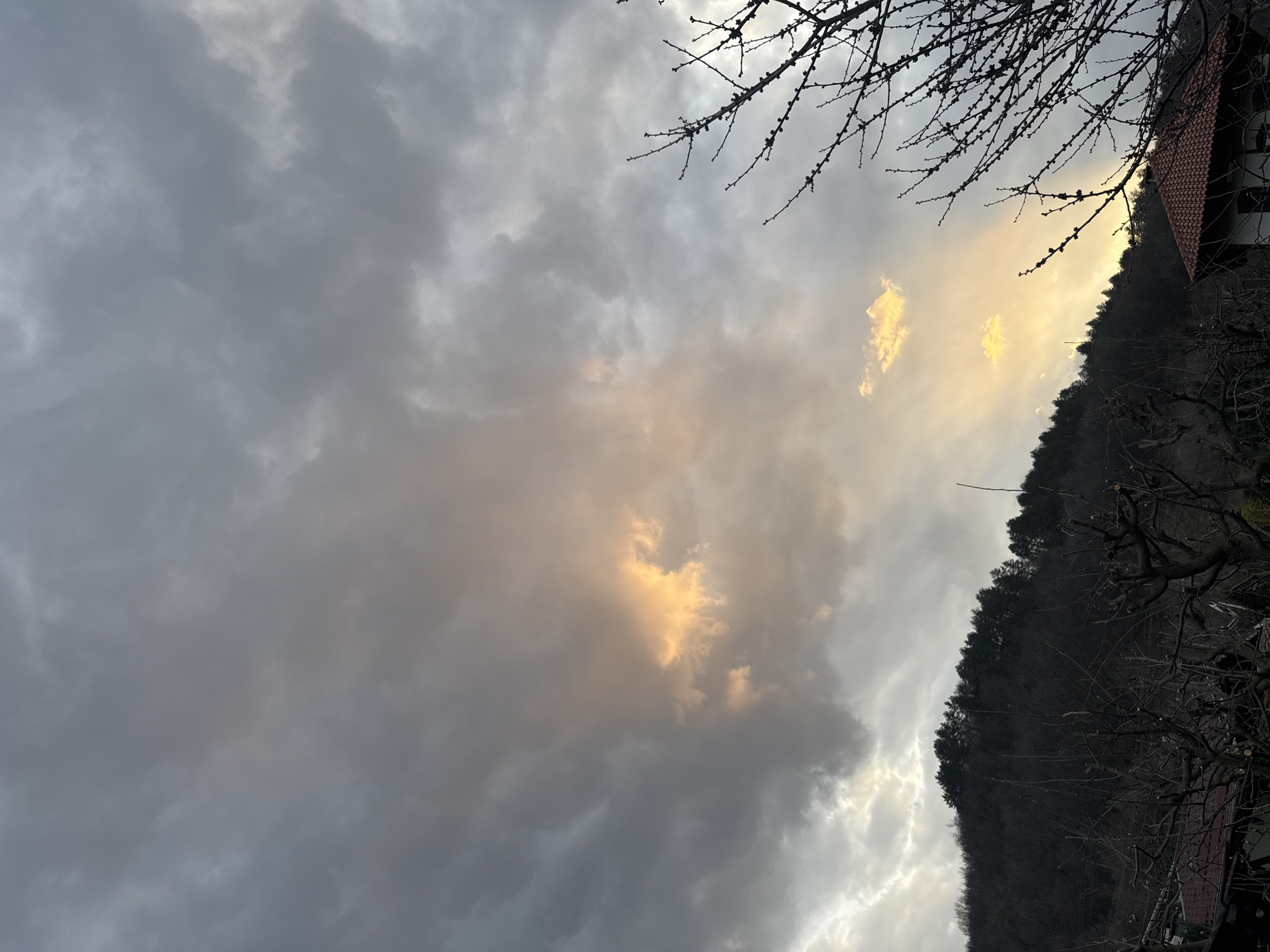 This image depicts an outdoor scene in Berkovitsa, Bulgaria, at what appears to be either sunrise or sunset, characterized by a heavily overcast sky with breaks of light. The upper two-thirds of the frame are dominated by dense, dark grey stratocumulus clouds, with two distinct areas of bright, warm yellow-orange light penetrating through the cloud cover: a larger, irregular patch centrally located in the upper left, and a smaller, elongated streak positioned towards the lower right horizon. The lower third of the image features a dark, tree-covered mountain or hill range stretching horizontally across the mid-ground, silhouetted against the brighter horizon. The trees on the upper slopes appear dense and evergreen, while lower down, deciduous trees with bare branches are visible. In the immediate foreground, dark, gnarled branches of deciduous trees, possibly pruned fruit trees, occupy the lower left and extend upwards along the right side of the frame, some showing early buds. A section of a residential building is partially visible in the lower right quadrant, featuring a terracotta-tiled roof and a segment of a white-painted wall with a dark window or opening, largely obscured by the foreground branches. No individuals or active interactions are discernible.