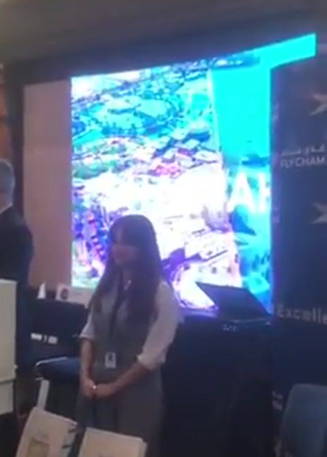 n indoor scene with a group of people. In the background is a large screen displaying scenes from different places. A man wearing a suit and glasses is standing at a table towards the left of the frame. Next to him is a stack of white boxes. A woman with long brown hair is standing in front of the screen, wearing a white shirt and a gray vest. She has a lanyard around her neck. To the right of the woman are promotional banners for "FLYCHAM". In the foreground, there are two small round tables with what appear to be information pamphlets on them. Blue upholstered chairs are arranged around the tables. The camera pans slightly, blurring the banners in the process.