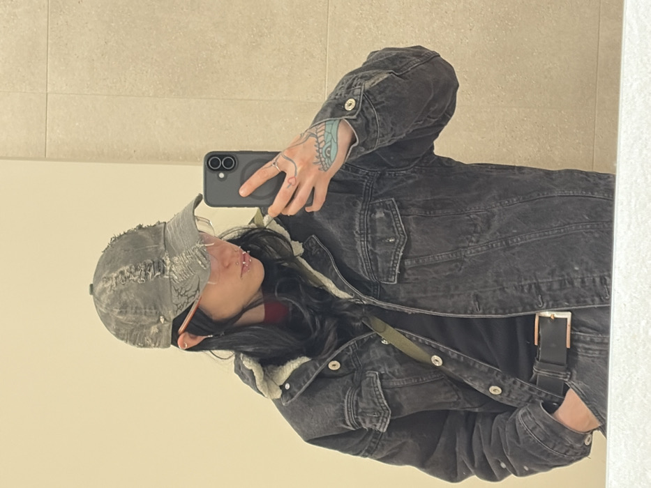 An individual is captured in a mirror selfie within an indoor setting, likely a restroom or changing area, in the city of Busmantsi, Bulgaria. The subject, a person with long dark hair, is wearing a distressed dark grey baseball cap, pushed-up clear-framed glasses, and has multiple facial piercings including horizontal labrets and ear piercings. They are dressed in a dark grey or black denim jacket with a visible sherpa lining, a red or maroon undershirt, and black pants secured by a black belt with a rectangular gold buckle. A dark olive green strap, likely from a bag, crosses the subject's chest. The individual's left hand, adorned with a heart-outline tattoo on the ring finger and a colorful, intricate tattoo on the back, holds a dark-colored smartphone with a dual-camera setup, pointed towards the mirror to capture the reflection. The right hand is partially obscured, tucked into a pocket. The background reflected in the mirror consists of a plain, light beige or cream-colored tiled wall with subtle grout lines. The bottom edge of the image shows a white or very light-colored surface below the mirror.