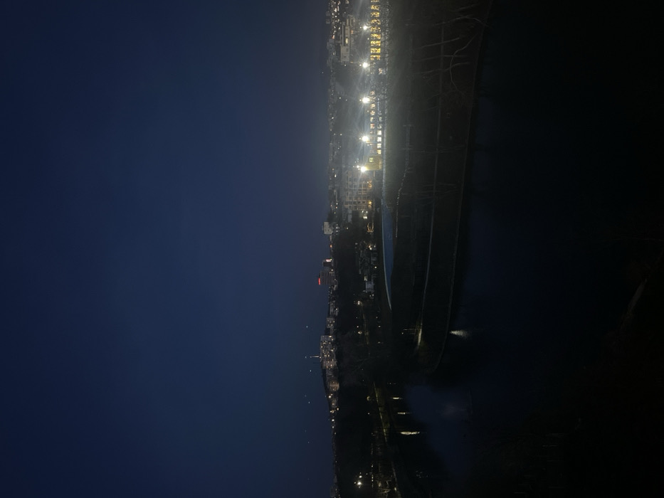 The image presents an elevated, wide-angle, nighttime view of the city of Yambol, Bulgaria. The Tundzha River curves through the foreground and midground from left to right, its dark water reflecting scattered artificial lights from the banks and distant structures. The riverbanks are predominantly dark, with a discernible light-colored, possibly paved or concrete area visible on the right bank, adjacent to a brightly illuminated complex. This complex features multiple prominent floodlights casting strong, localized light across a wide area, suggesting a sports facility or public recreation zone. In the background, the city skyline extends horizontally, characterized by numerous illuminated buildings and streetlights. One specific structure in the mid-distance to the right of the frame displays a red glowing sign. The sky above is a uniform dark blue, devoid of visible celestial bodies. No individuals, specific actions, or direct interactions are discernible within the frame due to the distance and low light conditions.