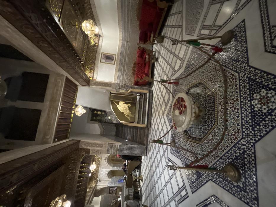 An ornately decorated room features a star-patterned tiled floor with a central fountain adorned with red flowers