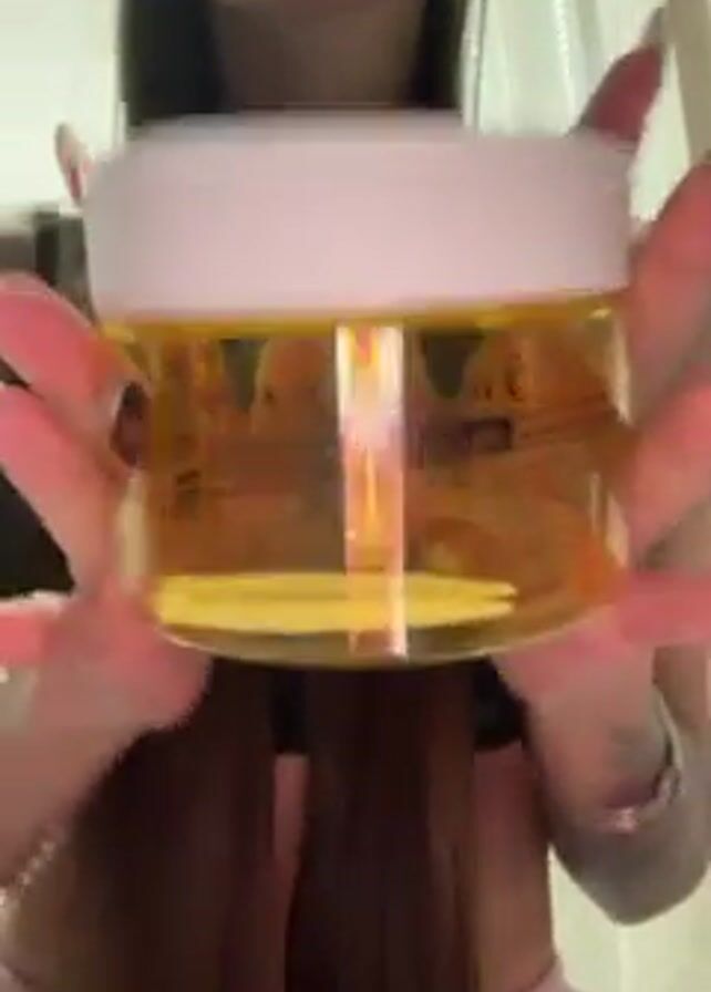 A woman is holding up a jar of AHA + Vitamin C cream. The jar is clear plastic with a white lid. The cream inside is yellow. The woman says that the first jar has been used up and that she has a second jar. She is wearing a black top and a pink skirt. The background is blurry, but it appears to be a bathroom.
