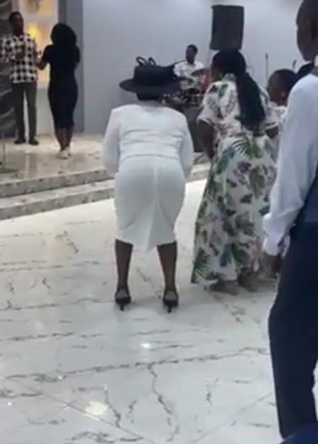 The video captures a celebratory dance scene in a large, brightly lit room. Several people are dancing on a marble-like tiled floor, with a band playing in the background. A woman in a white dress and black hat is at the center of the frame, shaking her hips to the music. To her right is a woman in a floral dress, also moving to the music. In the background, band members are visible behind a man in a black and white checkered shirt and a woman in a black dress who are also dancing. A speaker stands at the back of the room. A flower arrangement sits on a pedestal near the front left. The camera focuses primarily on the woman in the white dress as she dances.